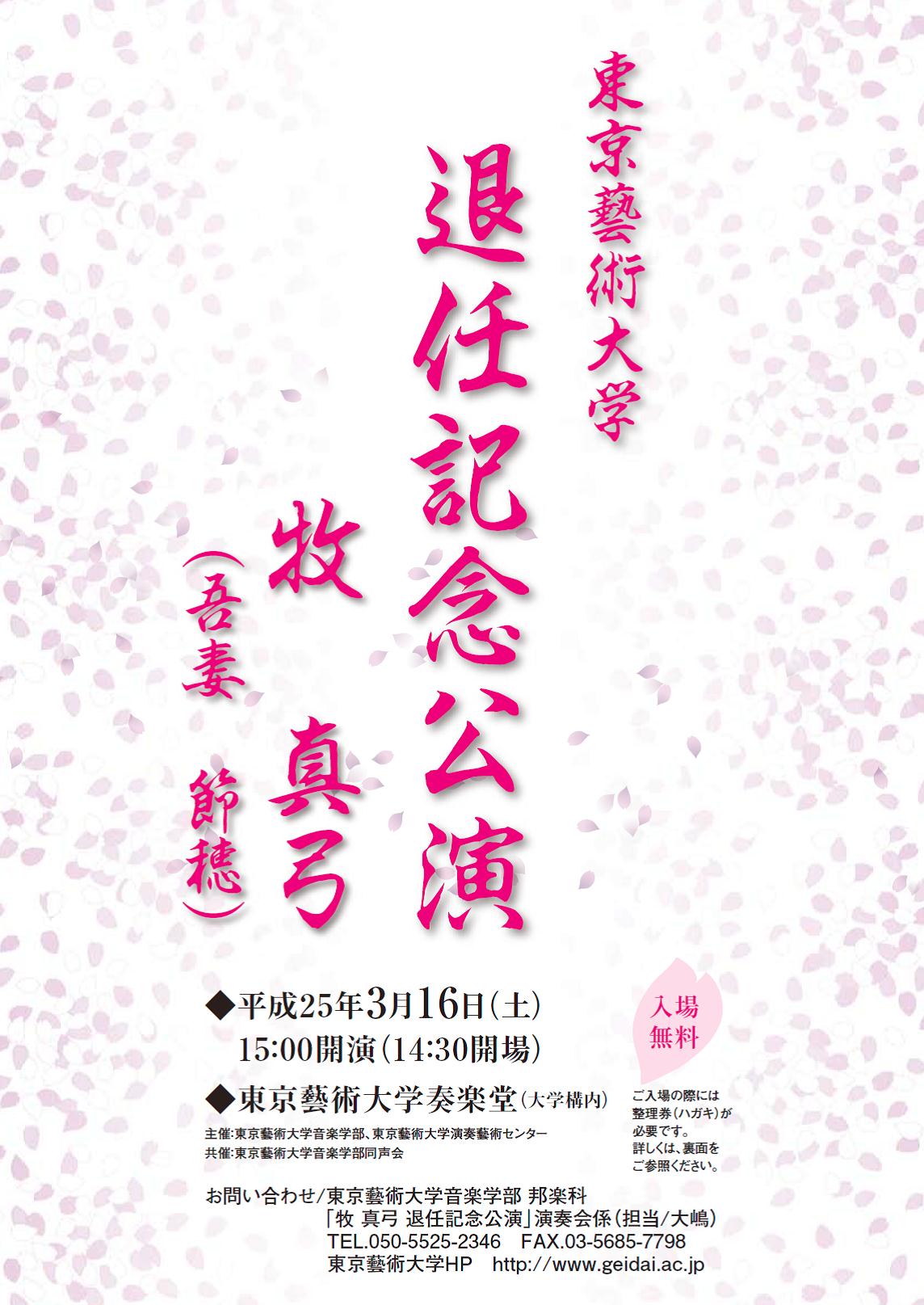 演奏会概要 演奏会名:牧真弓 退任記念公演 日時:2013年 3月 16日 (土)15:00 会場:東京藝術大学奏楽堂 主催:東京藝術大学音楽学部・東京藝術大学演奏藝術センター 共催:東京藝術大学音楽学部同声会 お話し 徳穂十種 藤間万三哉振付 清本 北 州 我妻節穂 作詞 千野喜資 作曲 萩岡松韻 振付 五條珠實 箏曲 花 の 寺 藤蔭静寿、花柳美輝風、西国領君嘉 長唄 賤 機 帯 狂女 我妻節穂 舟長 花柳輔太朗(賛助出演) Related Posts 視聴 藝大定期 吹奏楽 第83回 東京藝大ウィンドオーケストラ定期演奏会2017-07-05 視聴 2024年度 モーニング・コンサート 第13回2025-03-13 視聴 モーニング・コンサート 第1回2012-04-26 視聴 モーニング・コンサート 第8回2023-08-31 視聴 東京藝大ウィンドオーケストラ 学内演奏会2015-07-02