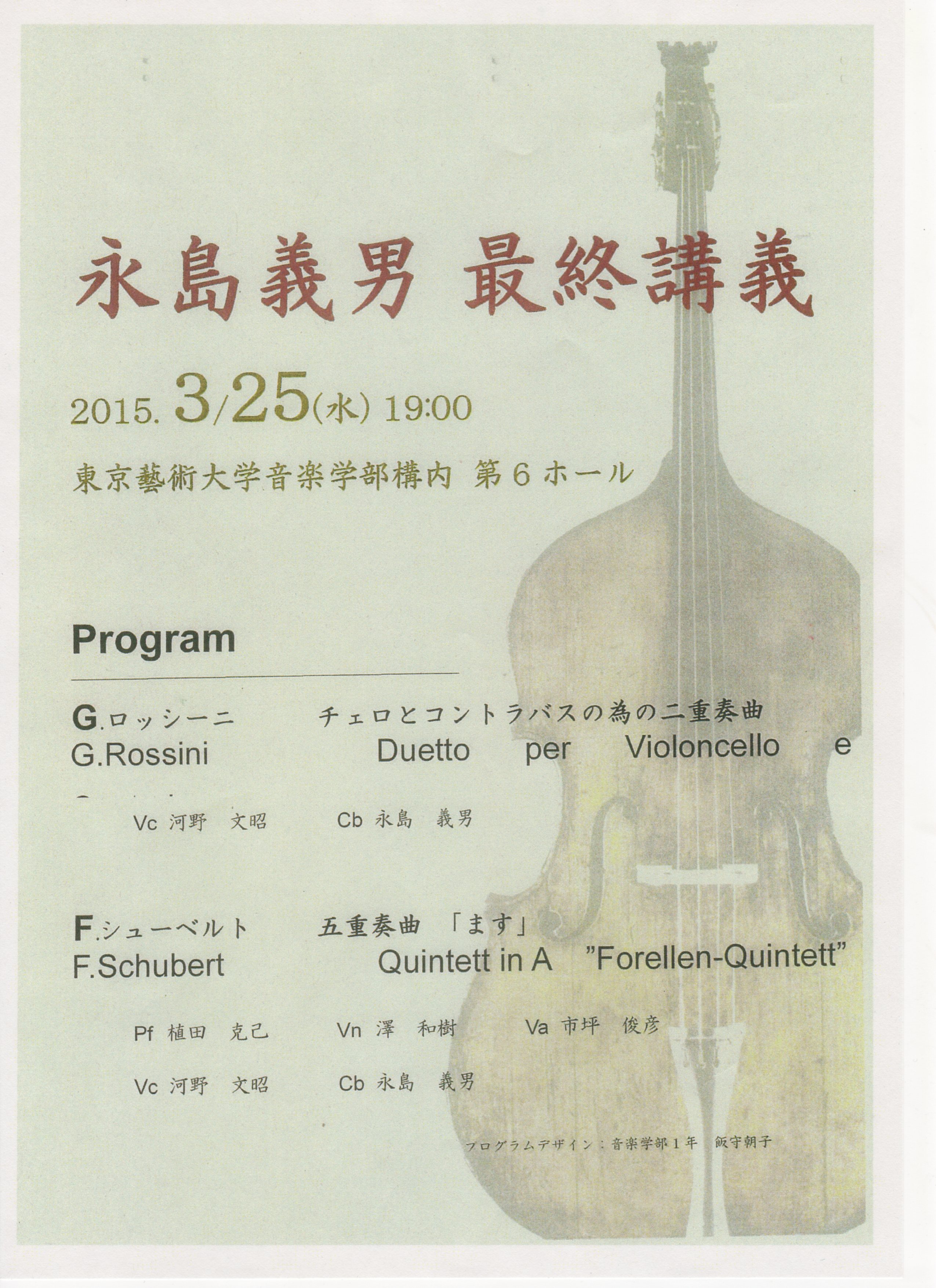 演奏会概要 演奏会名:永島義男 最終講義 日時:2015年 3月 25日 (水)19:00 会場:東京藝術大学第6ホール G. ロッシーニ:チェロとコントラバスの為の二重奏曲 チェロ :河野 文昭 コントラバス:永島 義男 F. シューベルト:五重奏曲「ます」 ピアノ :植田 克己 ヴァイオリン:澤 和樹 ヴィオラ :市坪 俊彦 チェロ :河野 文昭 コントラバス:永島 義男 録画:竹岡 智行、田川 めぐみ 録音:岩崎 真 Related Posts 視聴 モーニング・コンサート 第8回2011-07-14 視聴 藝大アートスペシャル2011【第2日】障がいとあーと2011-11-20 視聴 第71回 藝大オペラ定期公演「ドン・ジョヴァンニ」第2日2025-10-05 船木 麻代 博士学位審査演奏会2016-02-04 視聴 モーニング・コンサート 第8回2022-07-28