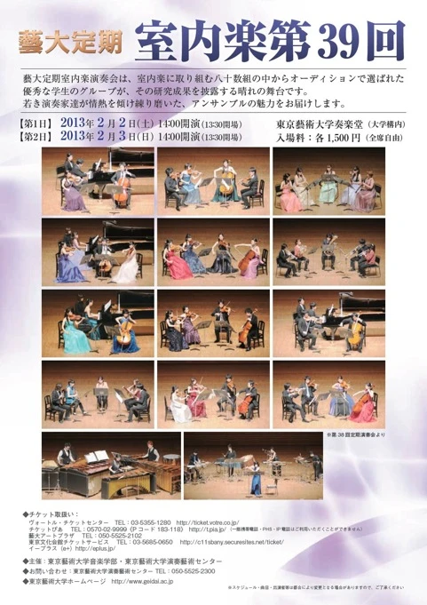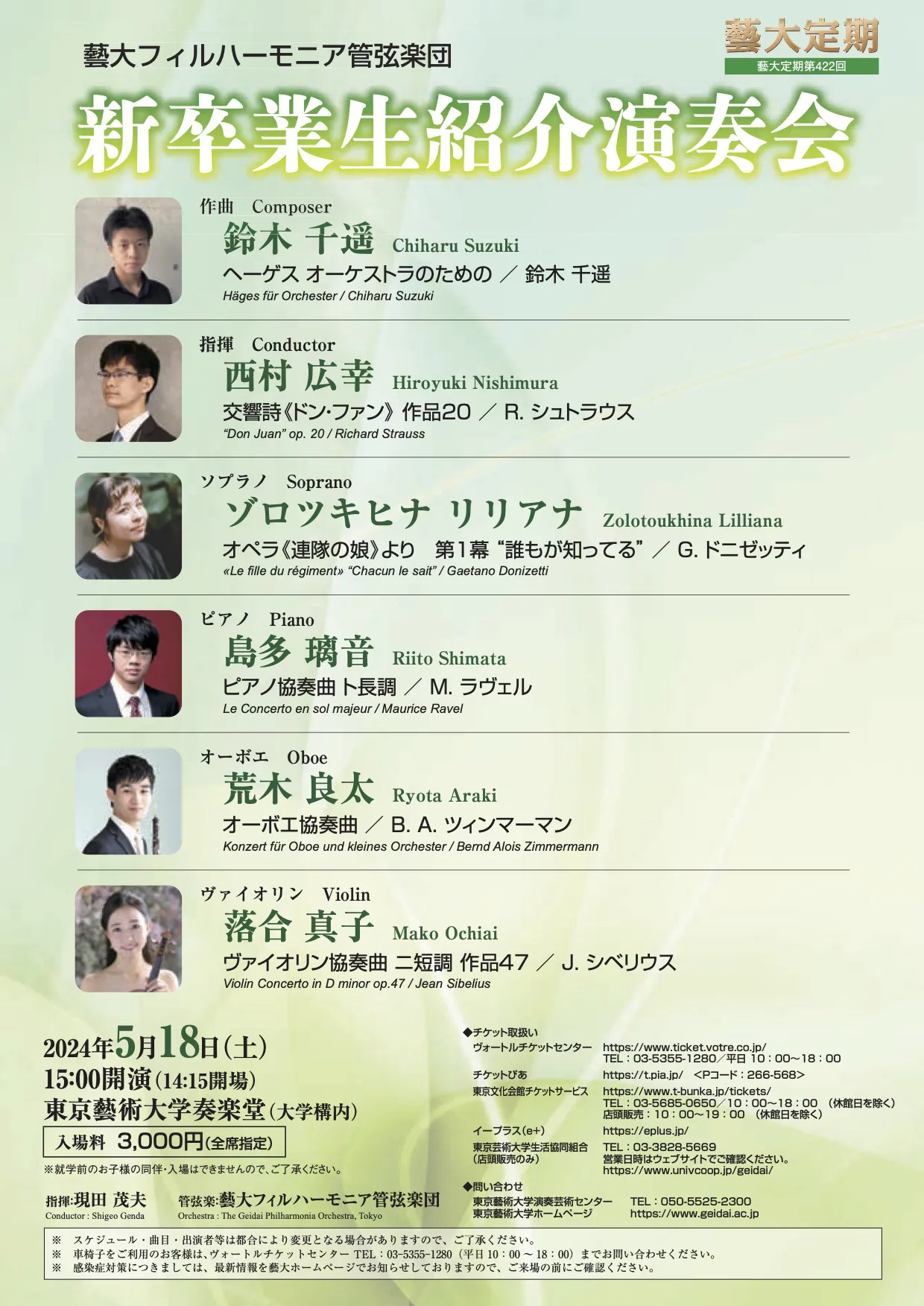 演奏会概要 演奏会名:モーニング・コンサート 第3回 日時:2016年 5月 19日(木)11:00 会場:東京藝術大学奏楽堂 主催:東京藝術大学音楽学部・東京藝術大学演奏藝術センター ボッテシーニ/コントラバス協奏曲 第2番 ロ短調 コントラバス:大槻 健 ワーグナー/ヴェーゼンドンク歌曲集 メゾ・ソプラノ:松浦 恵 指 揮:澤 和樹 管弦楽:藝大フィルハーモニア(東京藝術大学管弦楽研究部) Related Posts 視聴 第63回 藝大オペラ定期公演「フィガロの結婚」第1日2017-10-07 視聴 室内楽 第39回 【第2日】2013-02-03 視聴 「音楽の至宝」Vol.I 第1日 ピアノ・デュオ演奏会2013-07-07 視聴 2013年度 モーニング・コンサート 第3回2013-05-16 視聴 藝大フィルハーモニア管弦楽団 新卒業生紹介演奏会(藝大定期第422回)2024-05-18