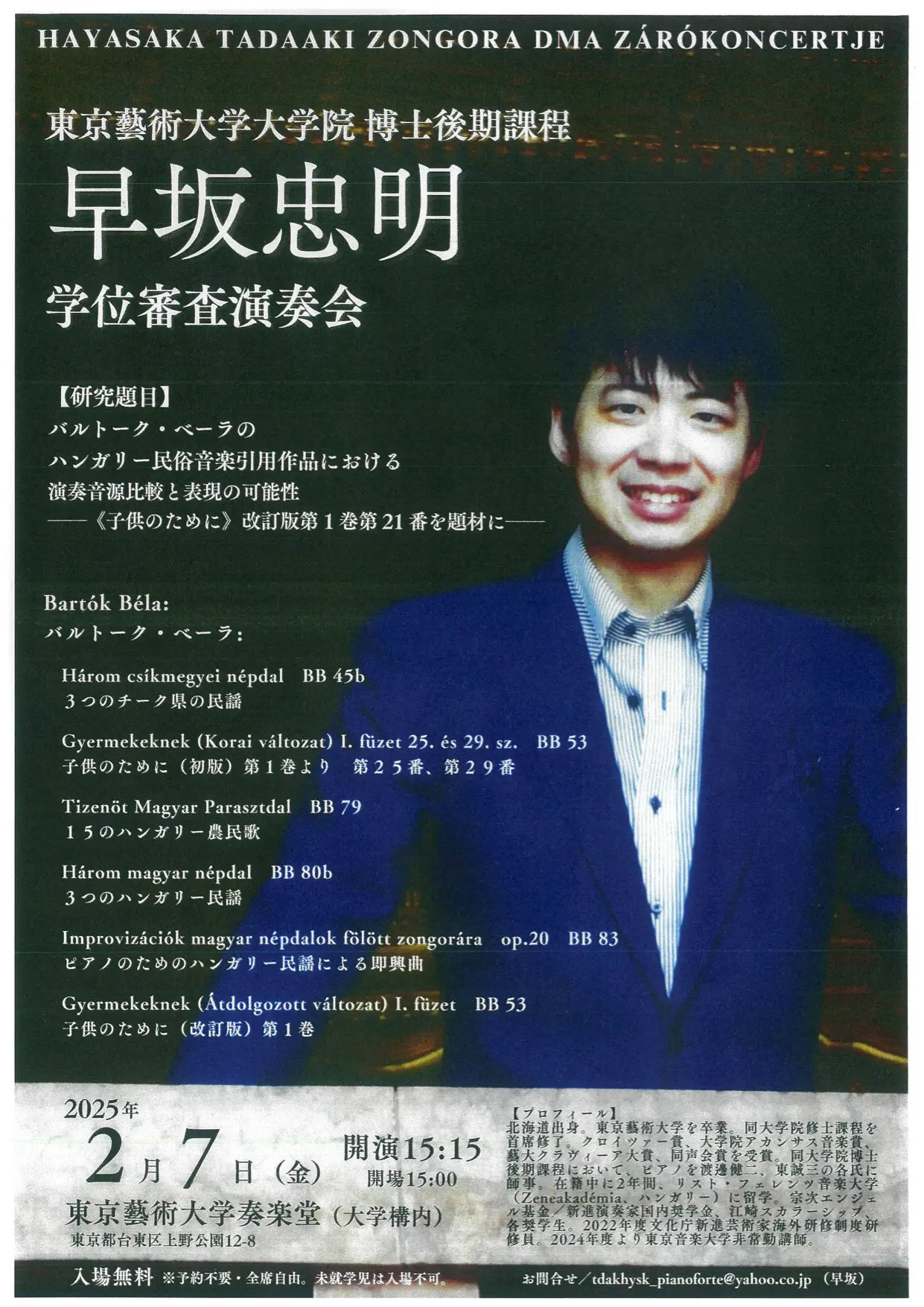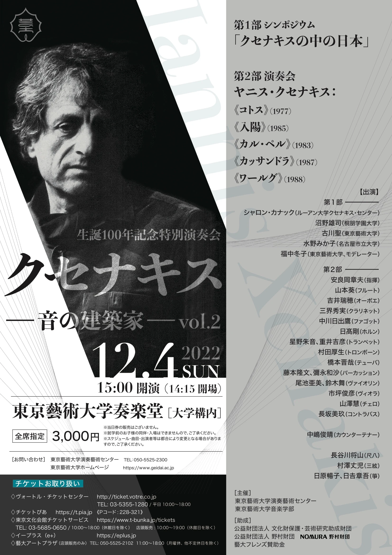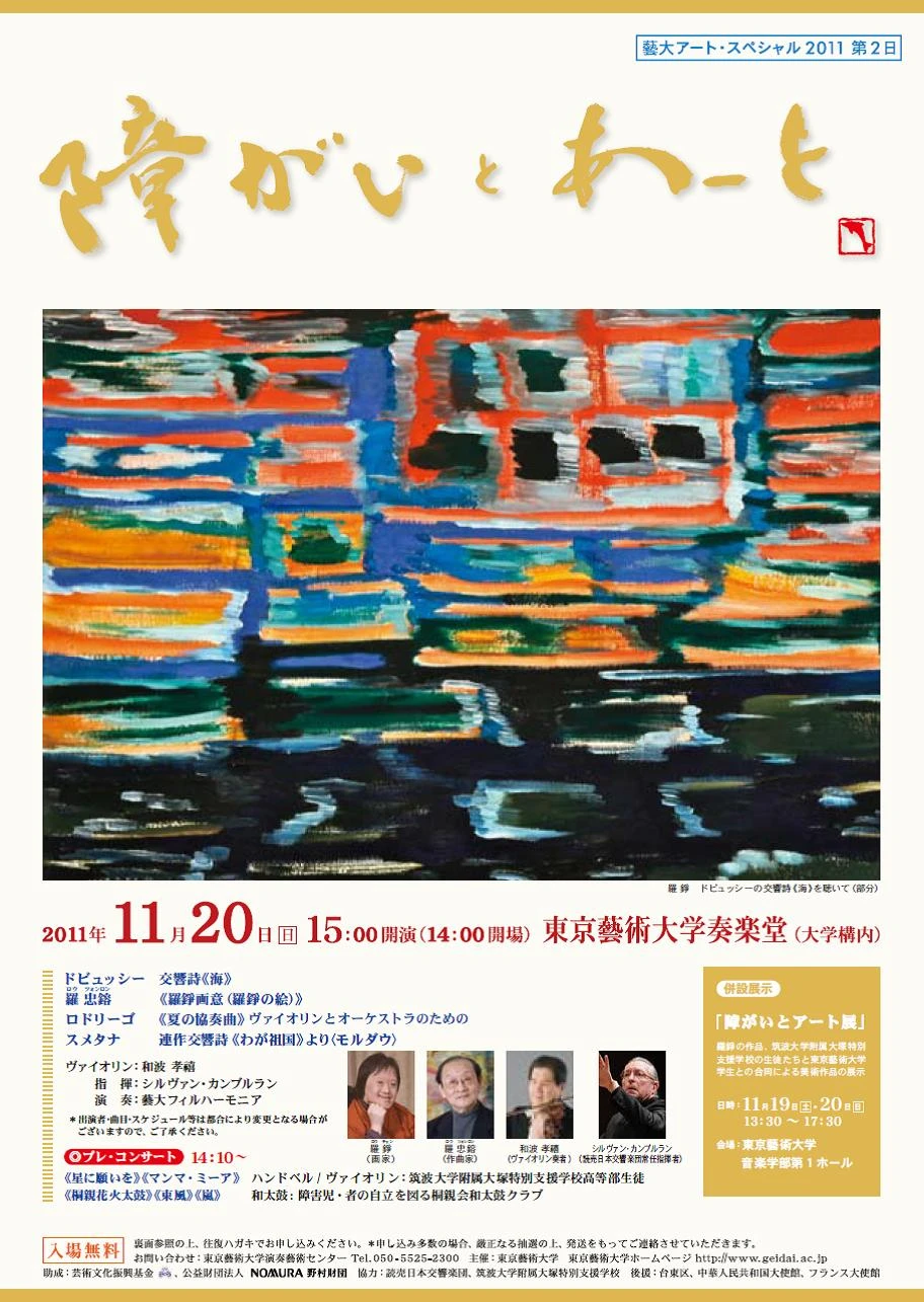 演奏会概要 演奏会名:東京藝術大学特別企画プレミアムコンサート 坂東玉三郎がいざなう鼓童の世界 日時:2016年 5月 29日 (日)13:00 会場:東京藝術大学奏楽堂 主催:東京藝術大学・東京藝術大学社会連携センター 協力:東京藝術大学演奏藝術センター・東京藝術大学COI拠点 ・大太鼓 ・屋台囃子 ・カデン ・Six Phases ・九界 ほか 【解説】 坂東玉三郎(東京藝術大学客員教授) 【演奏】 太鼓芸能集団 鼓童 芸術監督:坂東玉三郎 録音:鈴木 勝貴 録画:岩崎 真、田川 めぐみ Related Posts 視聴 佐藤 康子 博士学位審査演奏会 ── Madama Butterfly 蝶々夫人 ハイライト形式2009-11-02 視聴 特別演奏会 クセナキス 〜音の建築家〜 vol.22022-12-04 視聴 早坂 忠明 博士学位審査演奏会2025-02-07 視聴 藝大フィルハーモニア管弦楽団 定期演奏会2021-04-23 視聴 藝大アートスペシャル2011【第2日】障がいとあーと2011-11-20